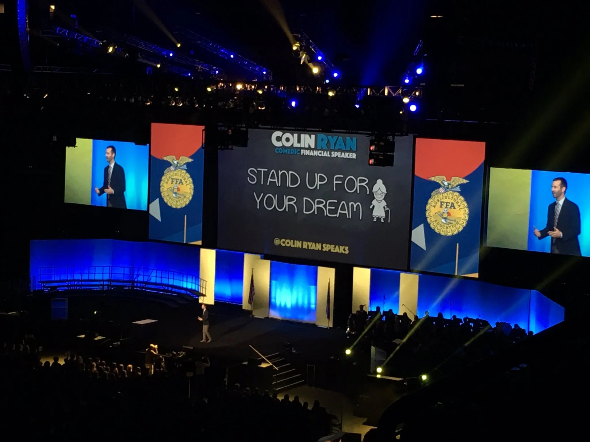 Funny financial speaker Colin Ryan delivering keynote to large student audience